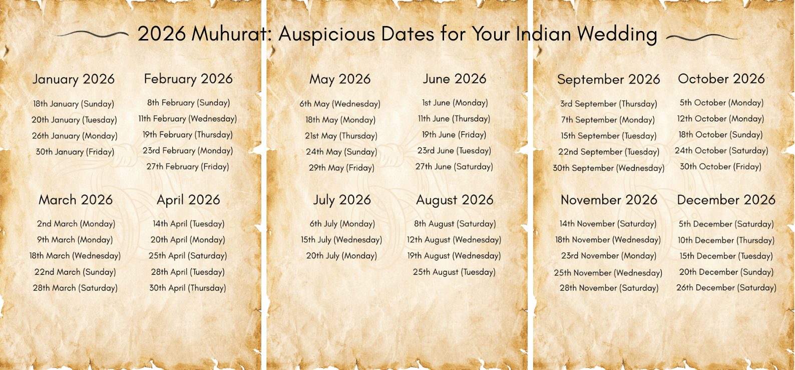 For couples planning a destination Indian wedding in 2026, aligning your celebration with the right dates can make your special day even more memorable. Here’s a glimpse of the Auspicious Hindu Wedding Dates in 2026, curated for couples who want to combine love with tradition. Because a truly meaningful wedding begins with perfect timing.